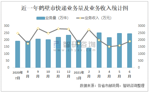 近一年鶴壁市快遞業務量及業務收入統計圖