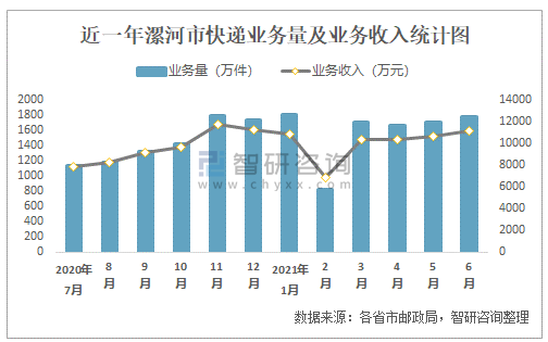 近一年漯河市快遞業務量及業務收入統計圖