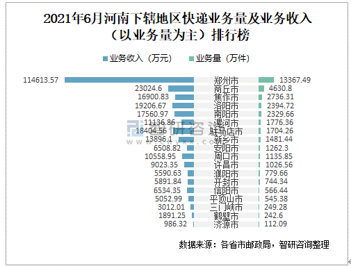 2021年6月河南下轄地區快遞業務量及業務收入(以業務量為主)排行榜