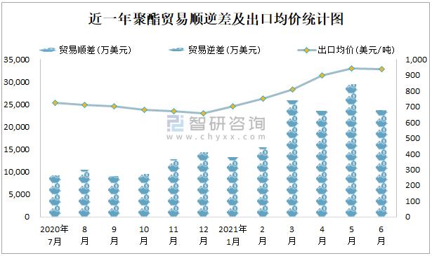 近一年聚酯貿(mào)易順逆差及出口均價(jià)統(tǒng)計(jì)圖