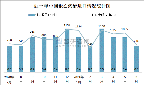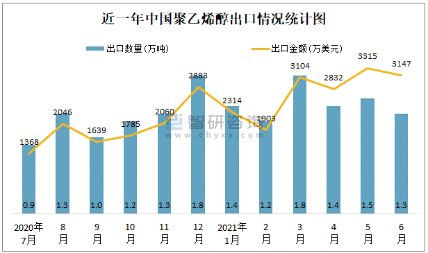 根據中國石油和化學工業聯合會數據顯示:2021年6月中國聚乙烯醇進口數量為0.3萬噸,進口金額為743萬美元;2021年6月聚乙烯醇出口數量為1.3萬噸,出口金額為3147萬美元;近一年中國聚乙烯醇出口總金額大于進口總金額,貿易順差為主,6月出口均價2420.8美元/噸。