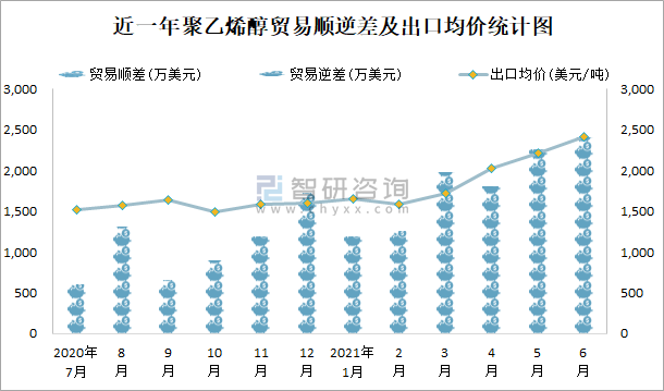 近一年聚乙烯醇貿易順逆差及出口均價統計圖