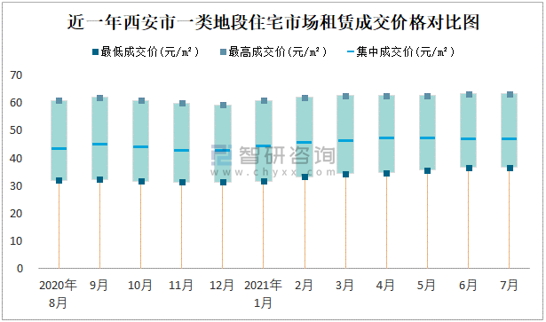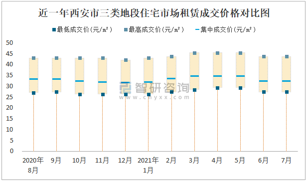 根據國信房地產信息網數據可知:近一年西安市一類地段住宅市場租賃成交價格有一定幅度波動,7月最高成交價與最低成交價差距為26.7元/m²;近一年西安市二類地段住宅市場租賃最低成交價與最高成交價的差距在24.33元/m²-26元/m²之間波動,2020年9月差距達到最大;近一年三類地段住宅市場租賃成交價格在26.33元/m²-45.33元/m²之間波動,7月集中成交價為32元/m²。