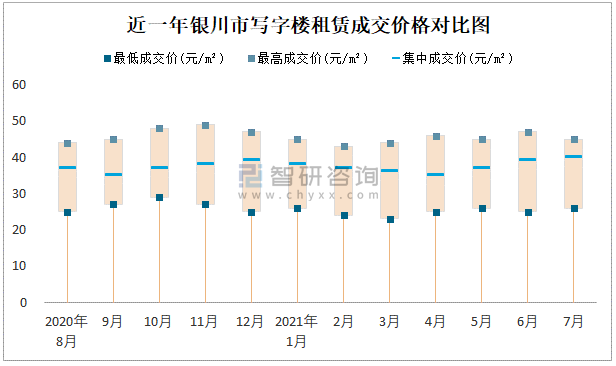 根據國信房地產信息網數據可知:近一年銀川市商業用房租賃集中成交價在45元/m²-52元/m²之間波動,7月集中成交價為47元/m²;寫字樓租賃集中成交價今年7月達到最高值(40元/m²)。