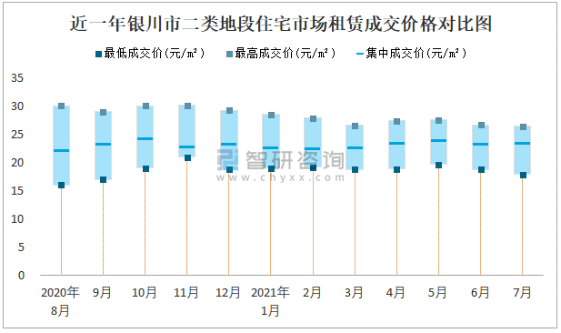 根據國信房地產信息網數據可知:2021年7月銀川市7類房屋中,公共租賃房租賃集中成交價為4.85元/m²,廉租房租賃集中成交價為1.1元/m²;商業用房租賃最低成交價、最高成交價、集中成交價均高于其他類房屋價格;三類地段住宅市場租賃集中成交價約為15.19元/m²,寫字樓租賃集中成交價高于所有類型地段住宅市場租賃集中成交價。