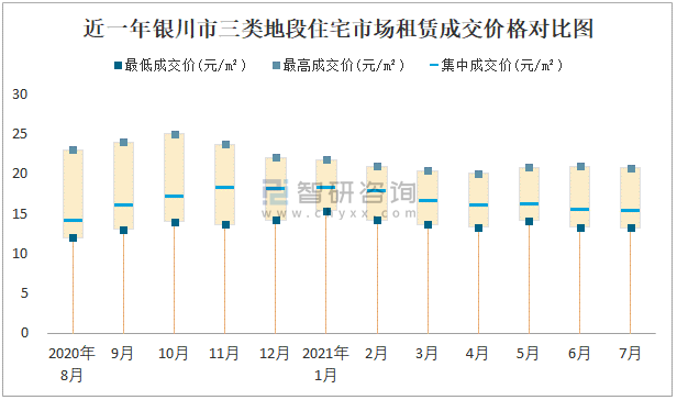 根據國信房地產信息網數據可知:近一年銀川市一類地段住宅市場租賃成交價格有一定幅度波動,7月最高成交價與最低成交價差距為9.8元/m²;近一年銀川市二類地段住宅市場租賃最低成交價與最高成交價的差距在7.79元/m²-14元/m²之間波動,2020年8月差距達到最大;近一年三類地段住宅市場租賃成交價格在12元/m²-25元/m²之間波動,7月集中成交價為15.19元/m²。