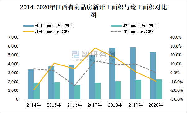 2014-2020年江西省商品房新開工面積與竣工面積對比圖