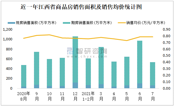 近一年江西省商品房銷售面積及銷售均價統計圖