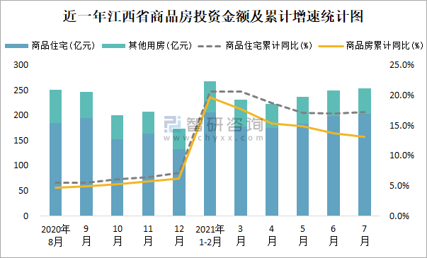 根據國家統計局數據統計可知:2021年7月江西省房地產開發投資商品房投資金額為254.58億元(其中商品住宅為203.08億元,辦公樓、商業營業用房等其他用房51.5億元);2021年1-7月江西省房地產開發投資商品房累計投資金額為1465.24億元,投資金額累計同比增長13.2%。