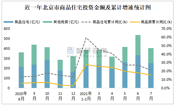 根據國家統計局數據統計可知:2021年7月北京市房地產開發投資商品房投資金額為404.25億元(其中商品住宅為251.12億元,辦公樓、商業營業用房等其他用房153.13億元);2021年1-7月北京市房地產開發投資商品住宅累計投資金額為1501.55億元,投資金額累計同比增長21.1%。