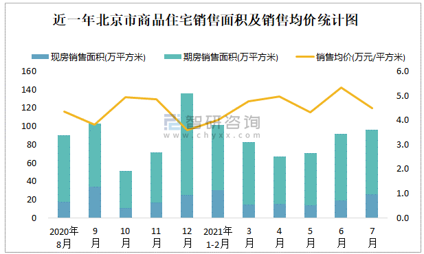 根據國家統計局數據可知:2021年7月北京市商品住宅銷售面積為96.2萬平方米(其中銷售現房25.71萬平方米,期房70.49萬平方米),銷售額為431億元,銷售均價約為4.48萬元/平方米;2021年1-7月北京市商品住宅累計銷售面積為508.39萬平方米,銷售面積累計同比增長80.6%,累計銷售額為2351.73億元,銷售額累計同比增長86.9%;近一年北京市商品住宅銷售均價2021年6月達到最高值,此后有所下滑,期房銷售面積遠高于現房銷售面積。