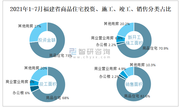 2021年1-7月福建省商品住宅投資、施工、竣工、銷售分類占比