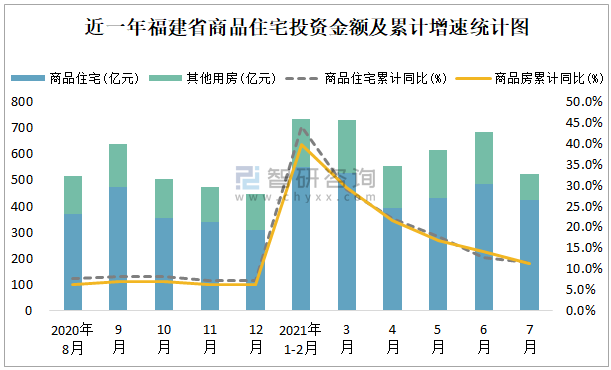 根據國家統計局數據統計可知:2021年7月福建省房地產開發投資商品房投資金額為524.09億元(其中商品住宅為422.07億元,辦公樓、商業營業用房等其他用房102.02億元);2021年1-7月福建省房地產開發投資商品住宅累計投資金額為2813.34億元,投資金額累計同比增長11.5%。