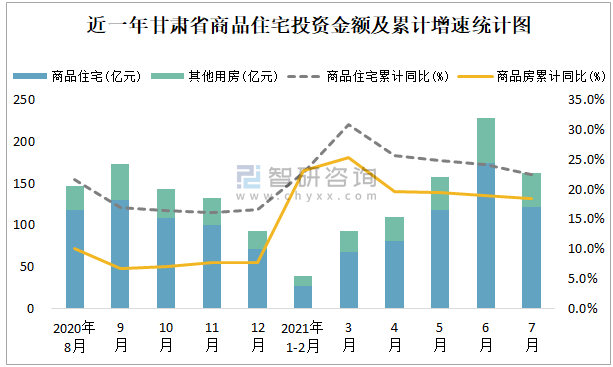 根據(jù)國家統(tǒng)計(jì)局?jǐn)?shù)據(jù)統(tǒng)計(jì)可知:2021年7月甘肅省房地產(chǎn)開發(fā)投資商品房投資金額為162.06億元(其中商品住宅為121.18億元,辦公樓、商業(yè)營業(yè)用房等其他用房40.88億元);2021年1-7月甘肅省房地產(chǎn)開發(fā)投資商品住宅累計(jì)投資金額為589.82億元,投資金額累計(jì)同比增長22.5%。