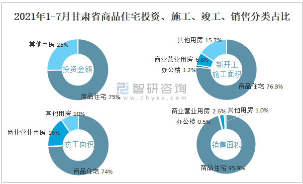 2021年1-7月甘肅省商品住宅投資、施工、竣工、銷售分類占比