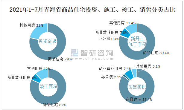 2021年1-7月青海省商品住宅投資、施工、竣工、銷售分類占比