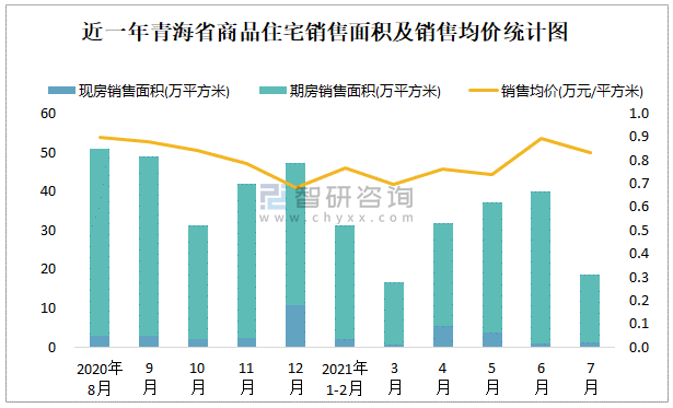 根據國家統計局數據可知:2021年7月青海省商品住宅銷售面積為18.62萬平方米(其中銷售現房1.19萬平方米,期房17.43萬平方米),銷售額為15.46億元,銷售均價約為0.83萬元/平方米;2021年1-7月青海省商品住宅累計銷售面積為175.37萬平方米,銷售面積累計同比下降12.5%,累計銷售額為138.37億元,銷售額累計同比下降15.3%;近一年青海省商品住宅銷售均價2020年8月達到最高值,此后有所下滑,期房銷售面積遠高于現房銷售面積。