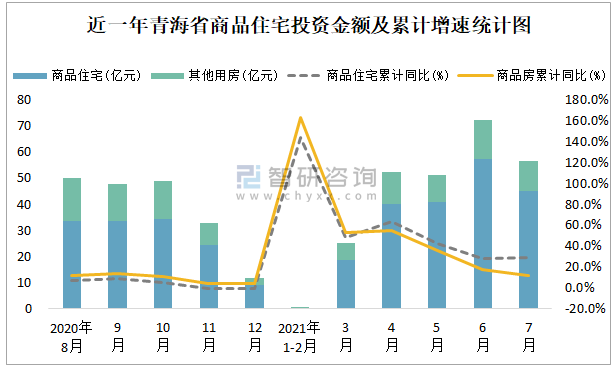 根據國家統計局數據統計可知:2021年7月青海省房地產開發投資商品房投資金額為56.63億元(其中商品住宅為45.12億元,辦公樓、商業營業用房等其他用房11.51億元);2021年1-7月青海省房地產開發投資商品住宅累計投資金額為202.61億元,投資金額累計同比增長29%。