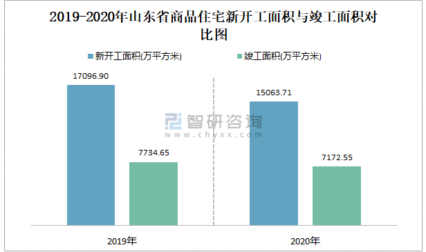 2019-2020年山東省商品住宅新開工面積與竣工面積對比圖
