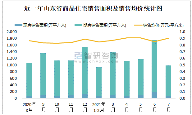 根據國家統計局數據可知:2021年7月山東省商品住宅銷售面積為982.1萬平方米(其中銷售現房68.29萬平方米,期房913.81萬平方米),銷售額為887.96億元,銷售均價約為0.9萬元/平方米;2021年1-7月山東省商品住宅累計銷售面積為7329.29萬平方米,銷售面積累計同比增長28.9%,累計銷售額為6435.38億元,銷售額累計同比增長33.7%;近一年山東省商品住宅銷售均價2020年10月跌至最低值,此后總體呈現上升趨勢,期房銷售面積遠高于現房銷售面積。