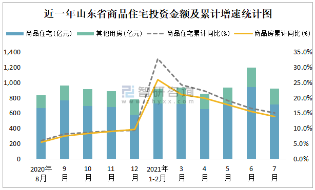 根據國家統計局數據統計可知:2021年7月山東省房地產開發投資商品房投資金額為924.31億元(其中商品住宅為712.45億元,辦公樓、商業營業用房等其他用房211.86億元);2021年1-7月山東省房地產開發投資商品住宅累計投資金額為4487.52億元,投資金額累計同比增長15.1%。