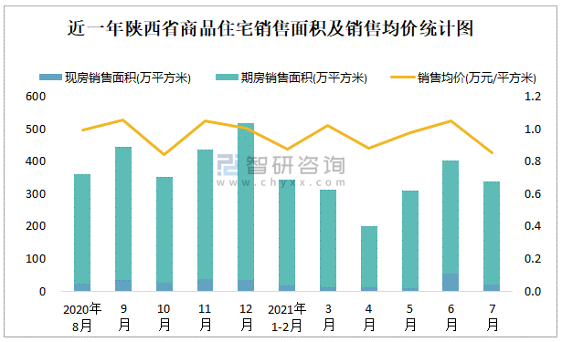 根據國家統計局數據可知:2021年7月陜西省商品住宅銷售面積為337.45萬平方米(其中銷售現房20.52萬平方米,期房316.93萬平方米),銷售額為287.15億元,銷售均價約為0.85萬元/平方米;2021年1-7月陜西省商品住宅累計銷售面積為1911.3萬平方米,銷售面積累計同比增長6.6%,累計銷售額為1813.64億元,銷售額累計同比增長9.6%;近一年陜西省商品住宅銷售均價2020年9月達到最高值,此后有所下滑,期房銷售面積遠高于現房銷售面積。