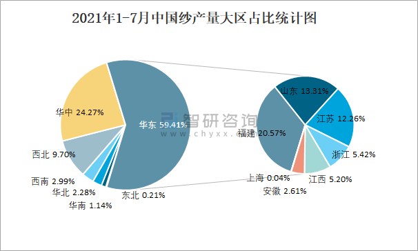 2021年1-7月中國紗產(chǎn)量大區(qū)占比統(tǒng)計圖