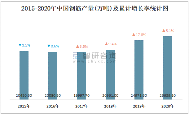 2015-2020年中國(guó)鋼筋產(chǎn)量及增長(zhǎng)情況統(tǒng)計(jì)圖