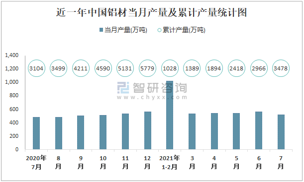 根據國家統計局數據顯示:2021年7月中國鋁材產量為521萬噸,同比增長5.3%;2021年1-7月中國鋁材累計產量為3478萬噸,累計增長12.3%;2015-2020年中國鋁材產量2018年跌至最低值,此后逐年遞增。
