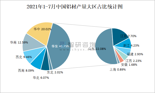 2021年1-7月中國鋁材產量大區占比統計圖
