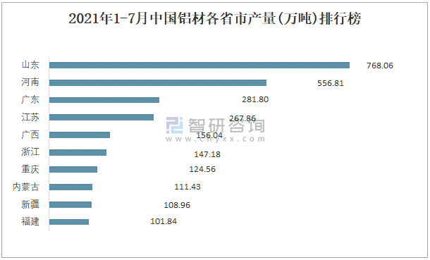 2021年1-7月中國鋁材各省市產量排行榜