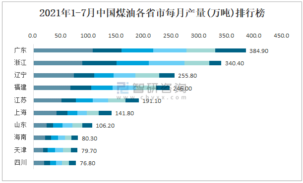 2021年1-7月中國煤油各省市每月產(chǎn)量排行榜