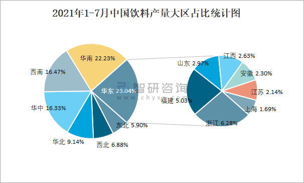 2021年1-7月中國(guó)飲料產(chǎn)量大區(qū)占比統(tǒng)計(jì)圖