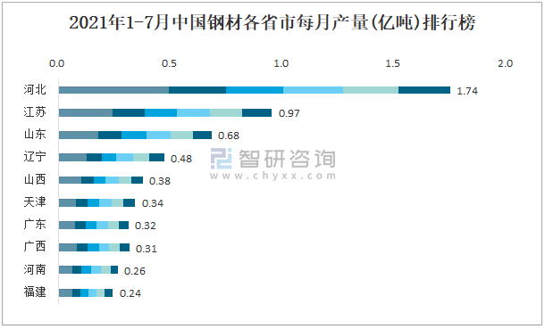 2021年1-7月中國鋼材各省市每月產量排行榜