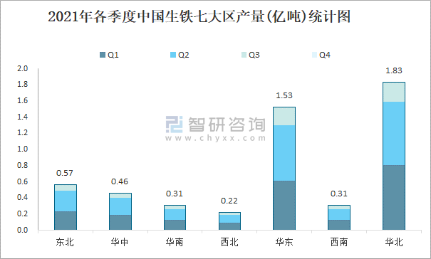 根據國家統計局數據顯示:2021年各季度(第三季度暫只統計7月數據)中國生鐵主要集中在華北、華東、東北地區生產;2021年1-7月中國生鐵產量大區分布不均衡,其中華北地區產量最高,特別是河北省貢獻了最多產量;2021年1-7月中國生鐵各省市產量top1遙遙領先于其他前9名。