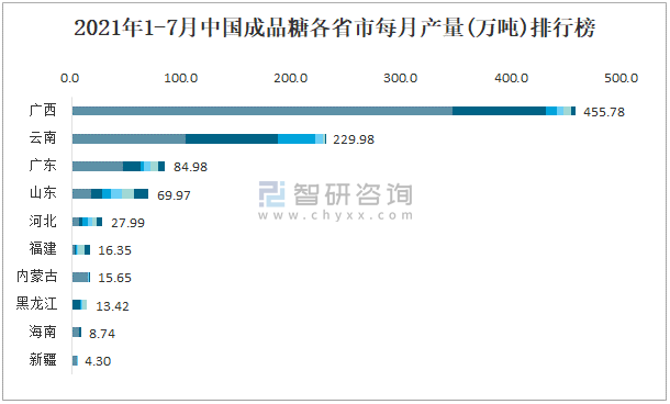 2021年1-7月中國成品糖各省市每月產量排行榜