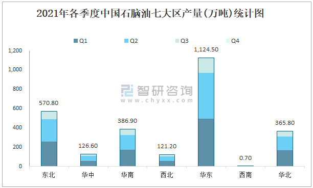 2021年各季度中國石腦油七大區(qū)產(chǎn)量統(tǒng)計圖