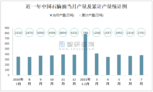 根據(jù)國家統(tǒng)計局數(shù)據(jù)顯示:2021年7月中國石腦油產(chǎn)量為382萬噸,同比增長3.4%;2021年1-7月中國石腦油累計產(chǎn)量為2701.4萬噸,累計增長11.4%;2015-2020年中國石腦油產(chǎn)量逐年遞增,2020年達到最高。