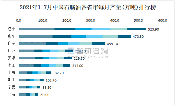 2021年1-7月中國石腦油各省市每月產(chǎn)量排行榜
