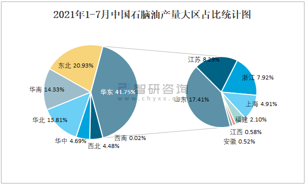 2021年1-7月中國石腦油產(chǎn)量大區(qū)占比統(tǒng)計圖