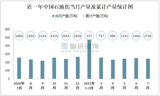 根據國家統計局數據顯示:2021年7月中國石油焦產量為247萬噸,同比下降5.9%;2021年1-7月中國石油焦累計產量為1744.9萬噸,累計增長2.6%;2015-2020年中國石油焦產量2018年起逐年遞增,2020年達到最高。