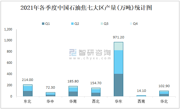 2021年各季度中國石油焦七大區產量統計圖