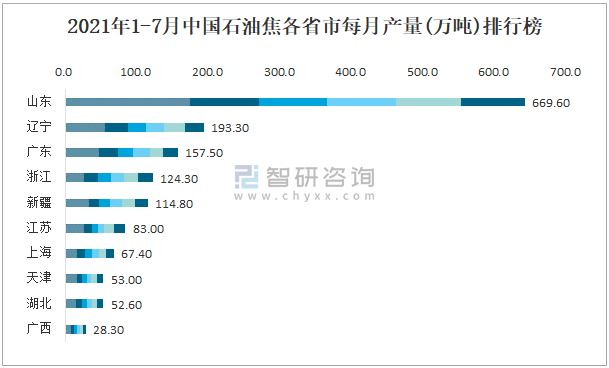 2021年1-7月中國石油焦各省市每月產量排行榜