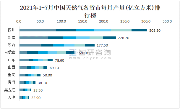2021年1-7月中國天然氣各省市每月產量排行榜