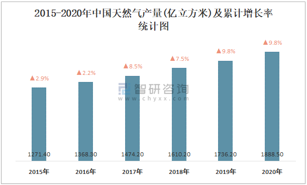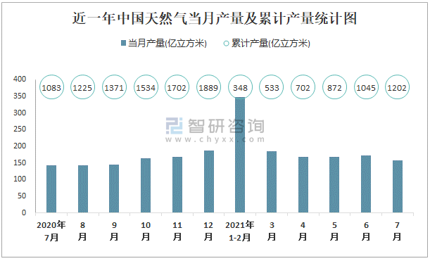 根據國家統計局數據顯示:2021年7月中國天然氣產量為158億立方米,同比增長9.8%;2021年1-7月中國天然氣累計產量為1201.9億立方米,累計增長10.7%;2015-2020年中國天然氣產量逐年遞增,2020年達到最高。