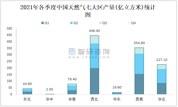 2021年各季度中國天然氣七大區產量統計圖