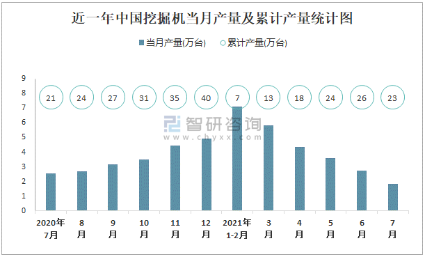 根據國家統計局數據顯示:2021年7月中國挖掘機產量為1.8萬臺,同比下降18.4%;2021年1-7月中國挖掘機累計產量為23.3萬臺,累計增長22.7%;2015-2020年中國挖掘機產量總體呈現上升趨勢,2020年達到最高。