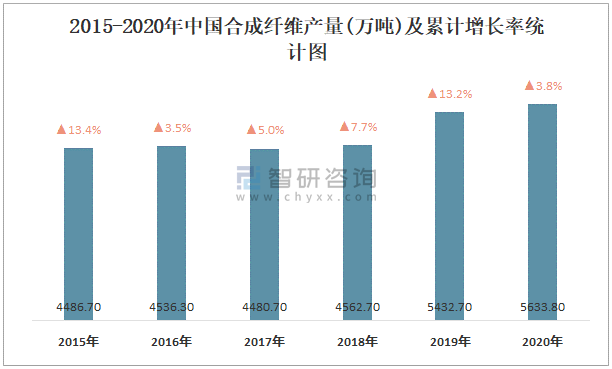 2015-2020年中國合成纖維產(chǎn)量及增長率統(tǒng)計圖