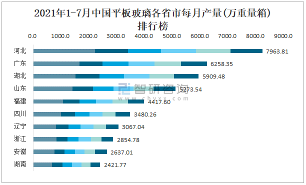 2021年1-7月中國平板玻璃各省市每月產量排行榜