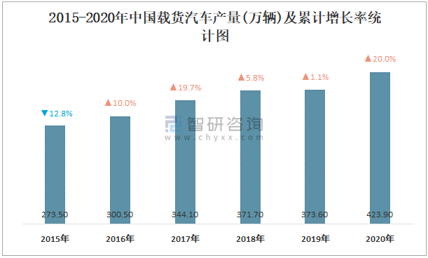 2015-2020年中國載貨汽車產量及增長率統計圖